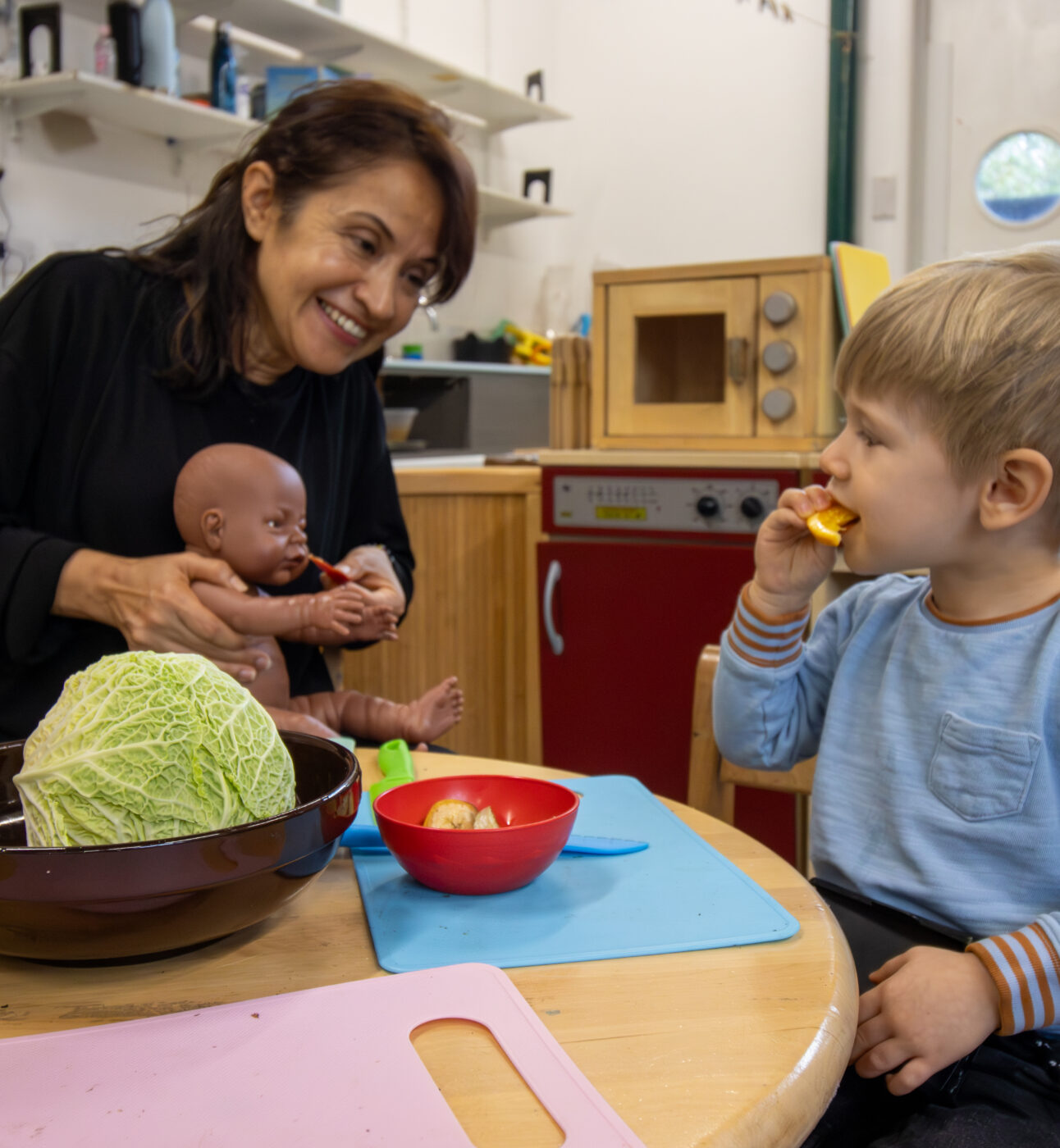 staff and child sitting under wooden tent reading a book